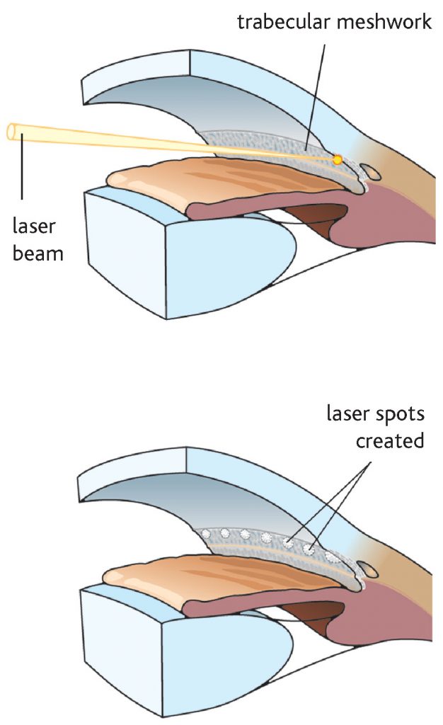 Ciśnienie wewnątrzgałkowe można obniżać farmakologicznie albo zabiegowo. Korzyścią leczenia operacyjnego jest brak konieczności stosowania kropli po zabiegu, oraz mniejsza inwazyjność niż operacji. Dlatego leczenie laserowe jest leczeniem pierwszego rzutu w jaskrze. Wykonuje się następujące zabiegi laserowe: